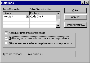 don't forget to activate the option rules of integrity and also the option of update in cascade. Otherwise, the relation of many to many is more difficult. So that a relation works, it's necessary that there is the same kind of information in both connected tables. The option " To update in cascade " makes sure that the information meets itself also in the other table. It's so useless to you to worry to have you the information in both tables. Access take charge of it for you.