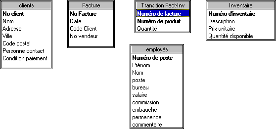 invoice number (Transition Fact-Inv), Codes customer Facture (Invoice), No. salesperson Facture (Invoice), Number of product (Transition Fact-Inv), Quantity (Transition Fact-Inv), Unit price (Inventory).