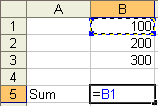 Place the cursor in the B5 cell. Write the following formula: =sum(. By using the up cursor, move the active cell in the B1 cell. While pressing on the Shift key, use the down cursor to move to the B3 cell.