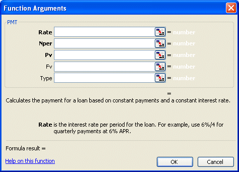 The PMT function window of the will appear. It shows the boxes that need information for the formula to work. The titles that are in bold (rate, number of periods and present value) are required. The titles that are of standard size (Fv and Type) are compulsory.