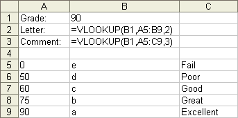 The B1 cell will contain the number of the grade. The B2 cell will contain the =Vlookup function that will compare the number in the B1 cell and will show a letter that's the equivalent to the grade. The B3 cell will contain a =Vlookup function that will compare the grade with the comparison table and show the appropriate comment. The A5 to B9 cells contain the comparison table. The table indicates that the letter will be an " e " if you have a grade below 50. Between 50 and 60, the grade will be a " d ". Between 60 and 75, the grade will be a" c ". Between 75 and 85, the grade will be a" b ". And, for a grade of 85 or more, the grade will an " a ". For the =Vlookup function to work correctly, it needs three parameters: the cell address to compare (B1), the place of the comparison table ( A4:B8) and the column to be shown with the result (the second column or 2)