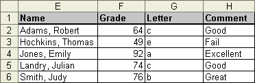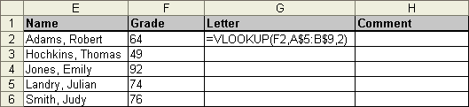 You can also copy the formula into the G3 to G6 cells to find the grades noted in the F3 to F6 cells. Don't forget to "fix" the position of the comparison table by placing a "$" in front of the rows in the formula. Or else the formula will not work. You'll learn more about copying formulas and relative and absolute reference on the next Web page.