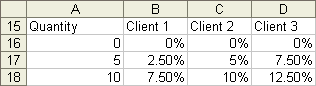 You now have a new comparison table that takes into consideration the quantities bought and the type of client. The percentage of the discount will vary depending on the quantity and the type of client. The D1 cell is also important because it now defines the type of client being served.